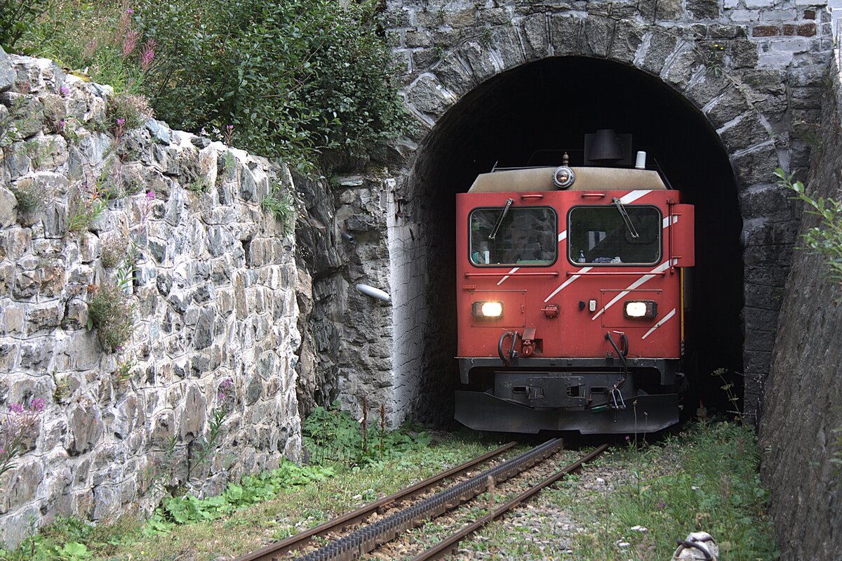 Die Dampfbahnfurkabergstrecke führt auch Züge mit einer grossen Dieselzahnradlok. Die Lok erscheint am 06.09.2024 im Westportal des Furkascheiteltunnels bei Muttbach und fährt Richung Gletsch und Oberwald.