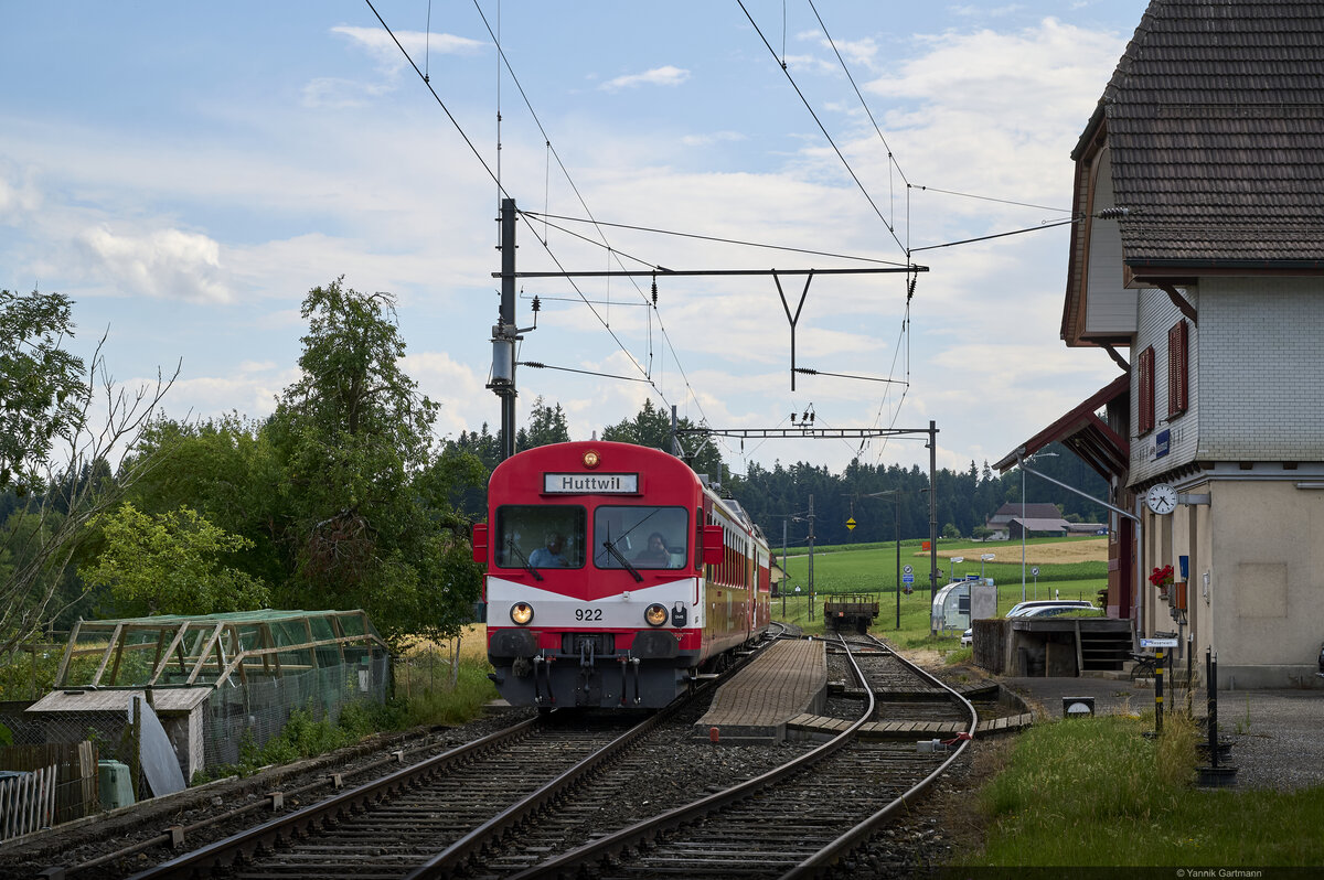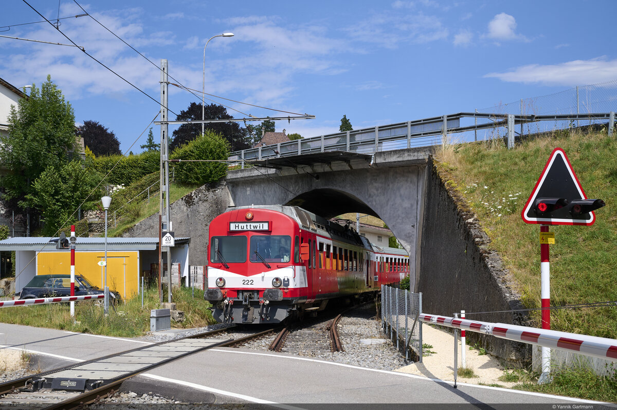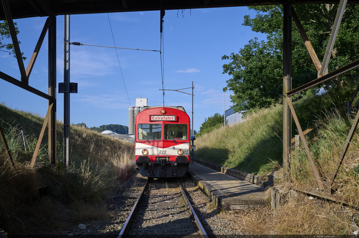 Mit dem RBDe 566 I 222 des VPM am 27.4.24 auf dem Grandvey-Viadukt.