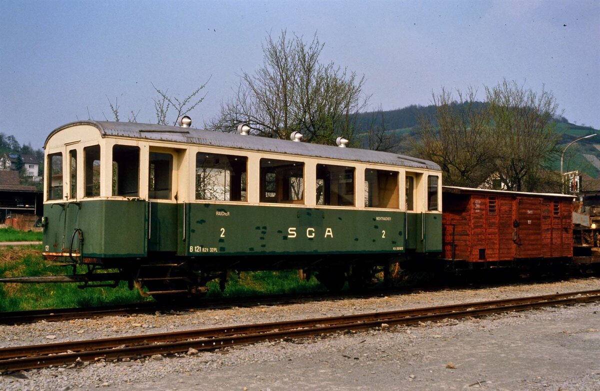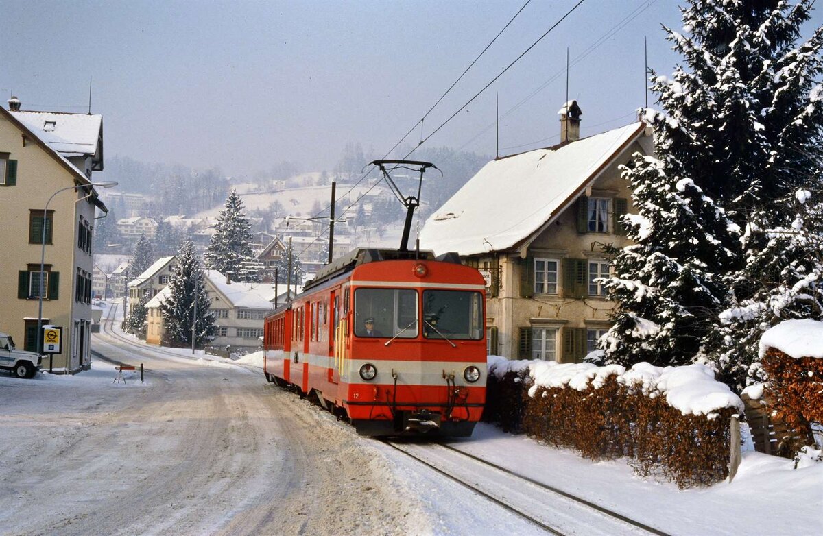 Im Frühjahr 1979 steht der 1930 gebaute ABDeh 4/4 3 der St. Gallen-Gais-Appenzeller Bahn (SGA) mit einem Personenzug nach Appenzell abfahrbereit im SGA-Bahnhof St. Gallen