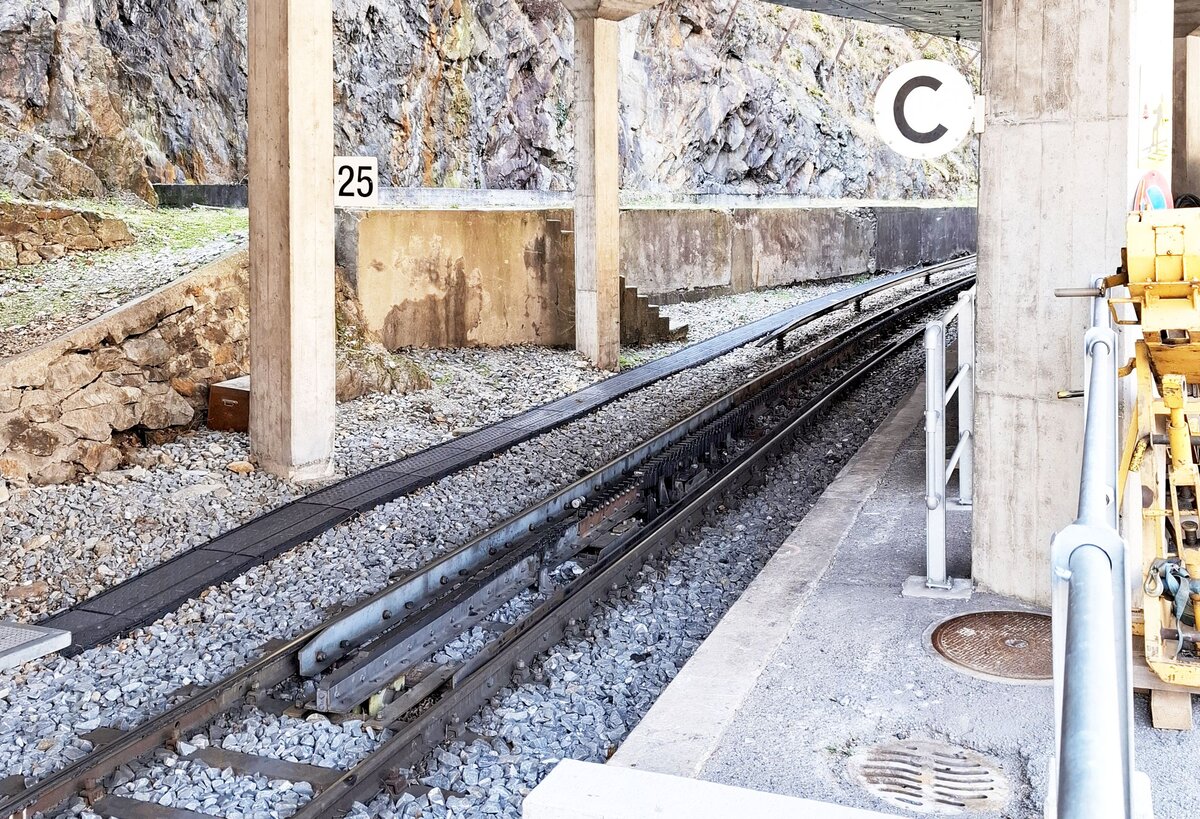 Mont-Blanc-Express__Direkt an der Stationsausfahrt in Vernayaz beginnt die Zahnradstrecke. Im Bild die Vorrichtung für einen sanften Eingriff der von der Adhäsionsstrecke aus Martigny kommenden Züge.__28-02-2026 Klaus-Erich Lisk