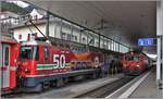Es ist der Winter 1979, ich fuhr mit meinen Eltern zum Skifahren in die Schweiz. Ich konnte sie überreden, in Scuol-Tarasp anzuhalten, um die Rhätische Bahn zu fotografieren. Das  Krokodil  der Rhätischen Bahn kannte ich schon, mehr wußte ich damals noch nicht. Links steht Ge 6/6 I 405 - ich denke sogar mit einem Gmp, einem Güterzug mit Personenbeförderung. Rechts steht die moderne Ge 4/4 II 616  Filisur  mit einem Zug nach St. Moritz.