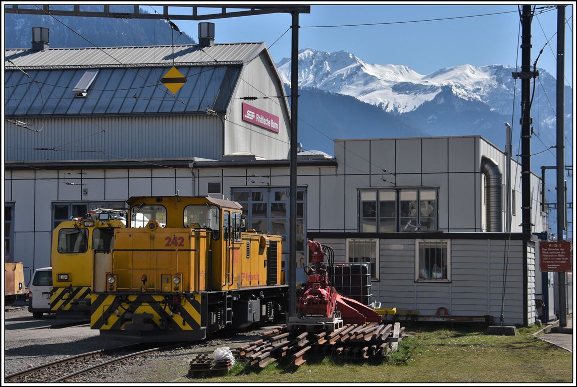 Nach getaner Arbeit ist die G 3/4 auf dem Weg ins Depot und trifft dabei auf die Ge 4/4 II Werbelok 617 Ilanz "RE POWER".