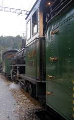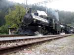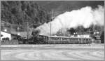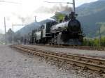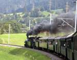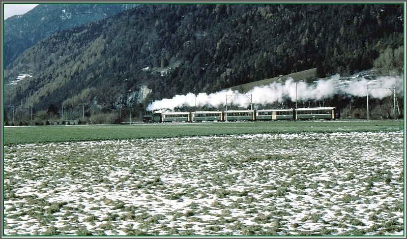 Nachschuss auf den gleichen Dampfzug wie vorheriges Bild, aber zwischen Felsberg und Domat/Ems. Wäre nicht die Dampffahne, man könnte den Zug glatt übersehen. Wie viel schöner kommt doch die heutige rote Farbe zur Geltung. (Archiv 11/82)