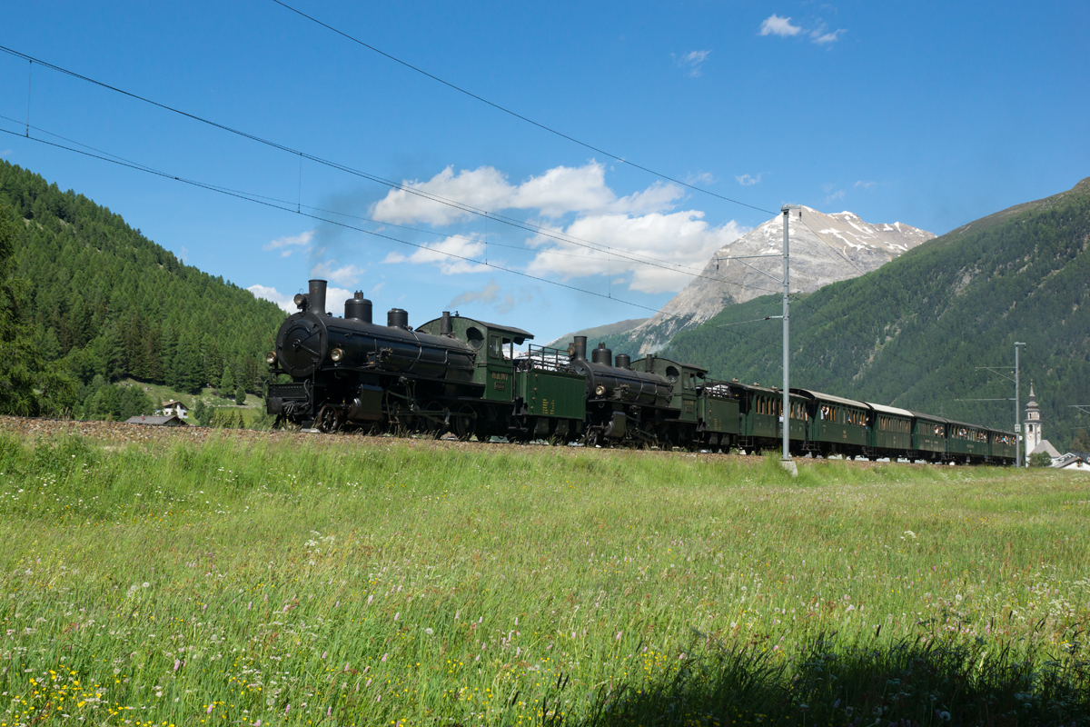 G 4/5 107 und G 4/5 108 sind soeben ins Val Bever eingebogen (Bever, 21.06.2014).