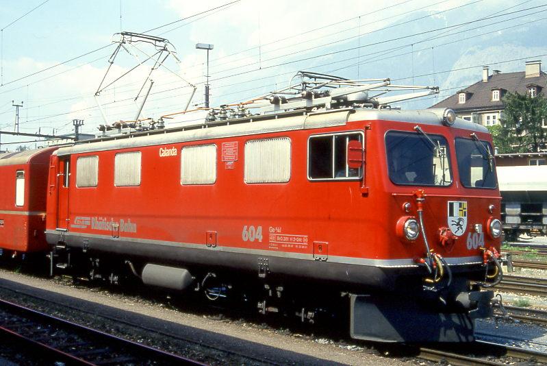 RhB - Ge 4/4I 604 "CALANDA" am 11.05.1994 in CHUR - STRECKEN-LOKOMOTIVE - Übernahme 23.08.1947 - SLM3923/MFO/BBC - 1184 KW - Gewicht 48,00t - LüP 12,10m - zulässige Geschwindigkeit 80 km/h. Hinweis: noch mit Scherenpantografen