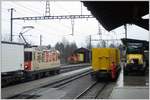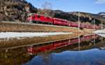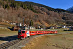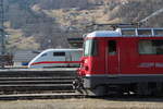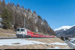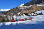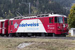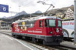 Engadiner Skimarathon am 12. März 2017: Login-Werbelok Ge 4/4 611 "Landquart" zwischen Samedan und Celerina. Am Zugende schiebt Ge 4/4 II 612 "Thusis".