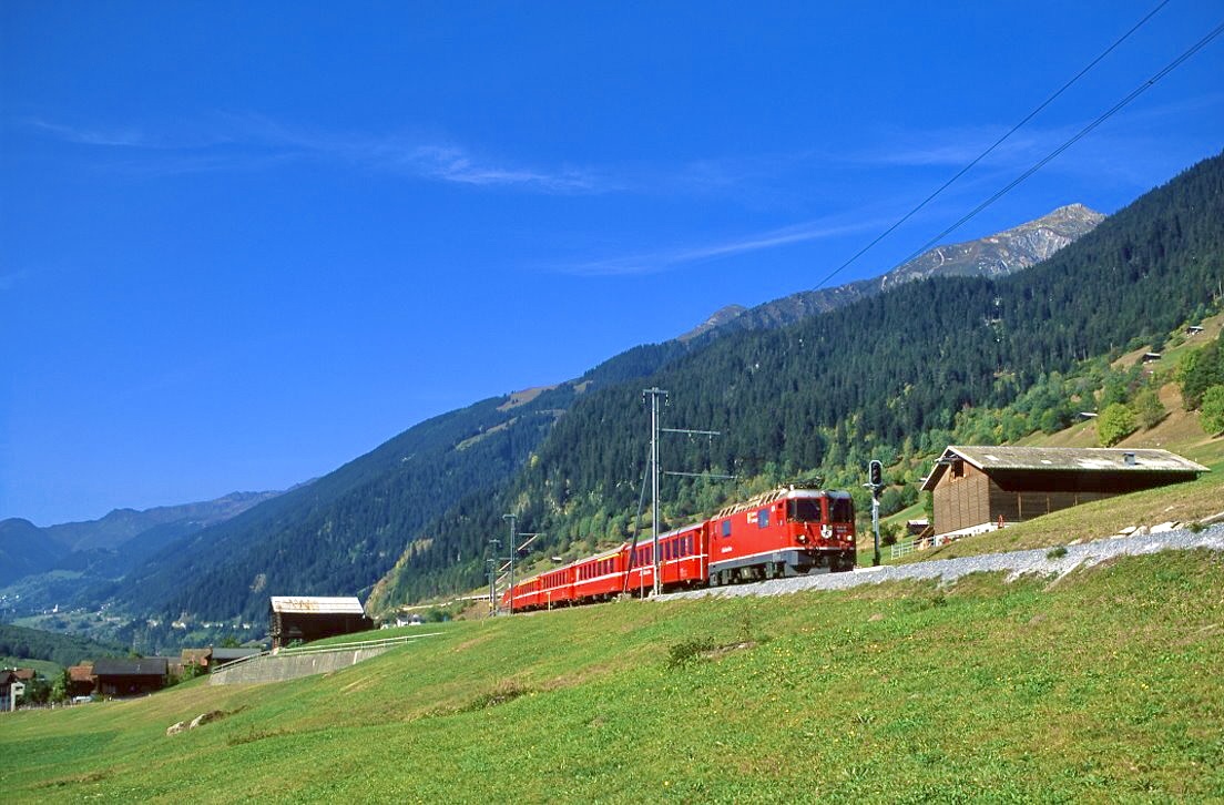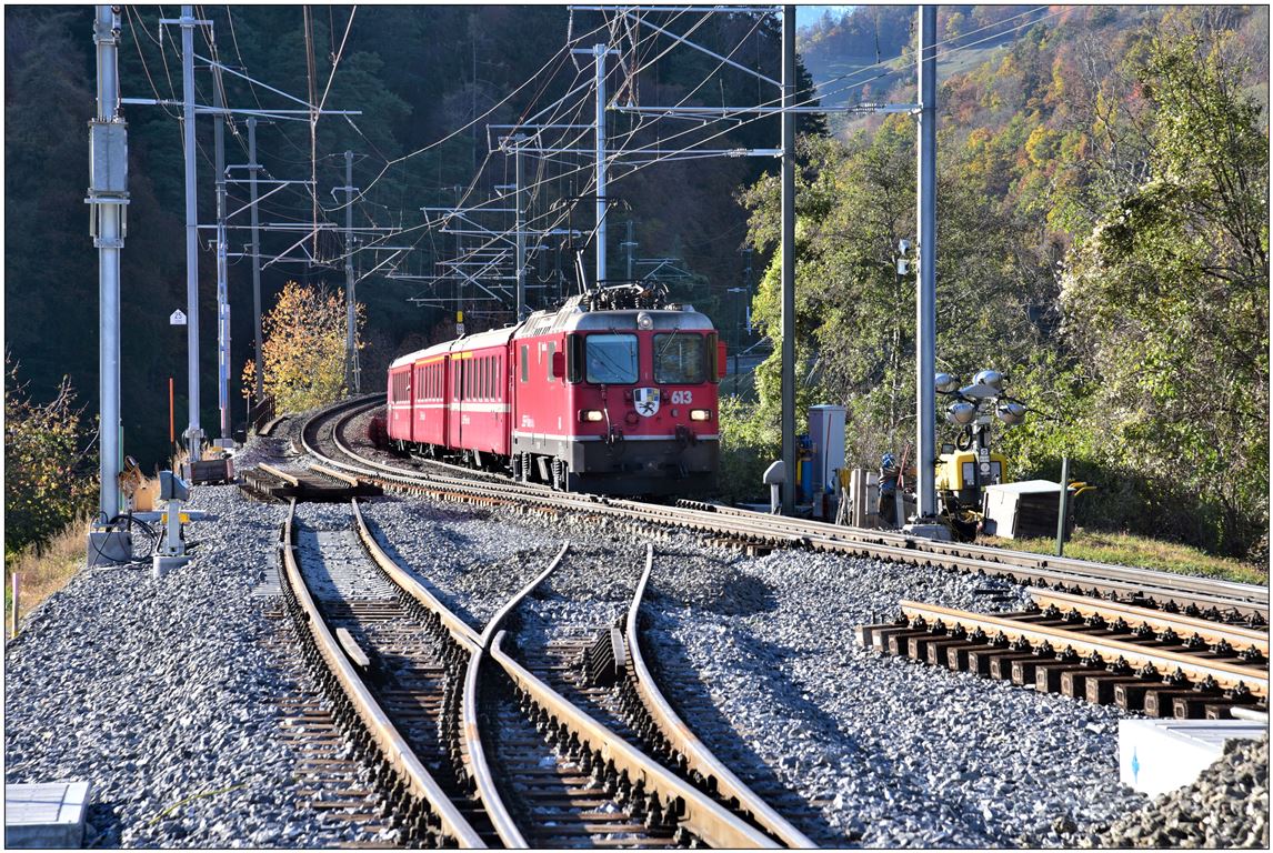 Ein letztes Mal konnte man gestern hier Fotos machen vor dem Anschluss der neuen Brücke. RE1744 mit der Ge 4/4 II 613 "Domat/Ems" aus Disentis mit der provisorischen Weiche Richtung Oberland. (03.11.2018)