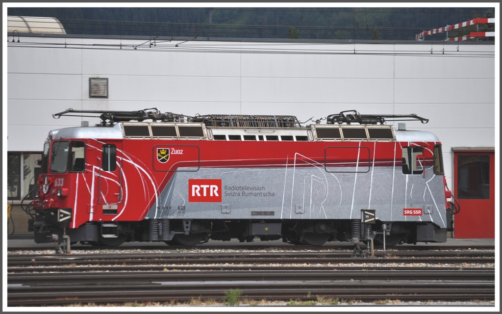 Eine neue Werbelok ist geboren.Die Ge 4/4 II 633 "Zuoz" wirbt für die vierte Landessprache der Schweiz mit Hilfe des rätoromanischen Fernsehen. Landquart (01.06.2011)