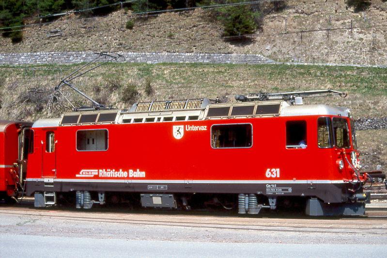 RhB - Ge 4/4 II 631 "UNTERVAZ" am 10.05.1992 in Bergün - Thyristor-Streckenlokomotive - Übernahme 22.11.1984 - SLM5272/BBC - 1700 KW - Gewicht 50,00t - LüP 12,74m - zulässige Geschwindigkeit 90 km/h - ®2=27.07.1992 - Logo RhB deutsch. Hinweis: ursprünglicher Anschriftenblock
