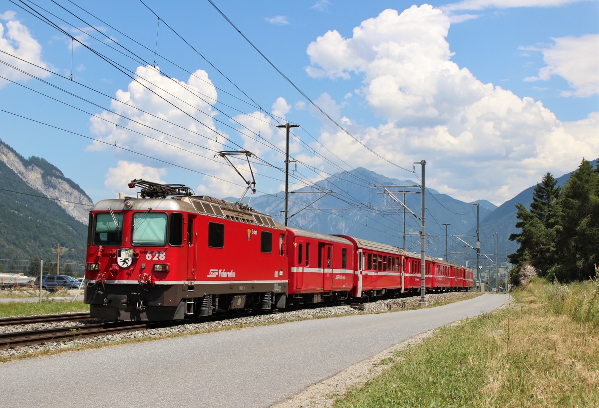 Am 26.Juli 2013 war Ge4/4 II Lok 628 der RhB mit einem Schnellzug aus Chur bei Domat/Ems-Emswerk auf dem Weg nach Reichenau-Tamins.
