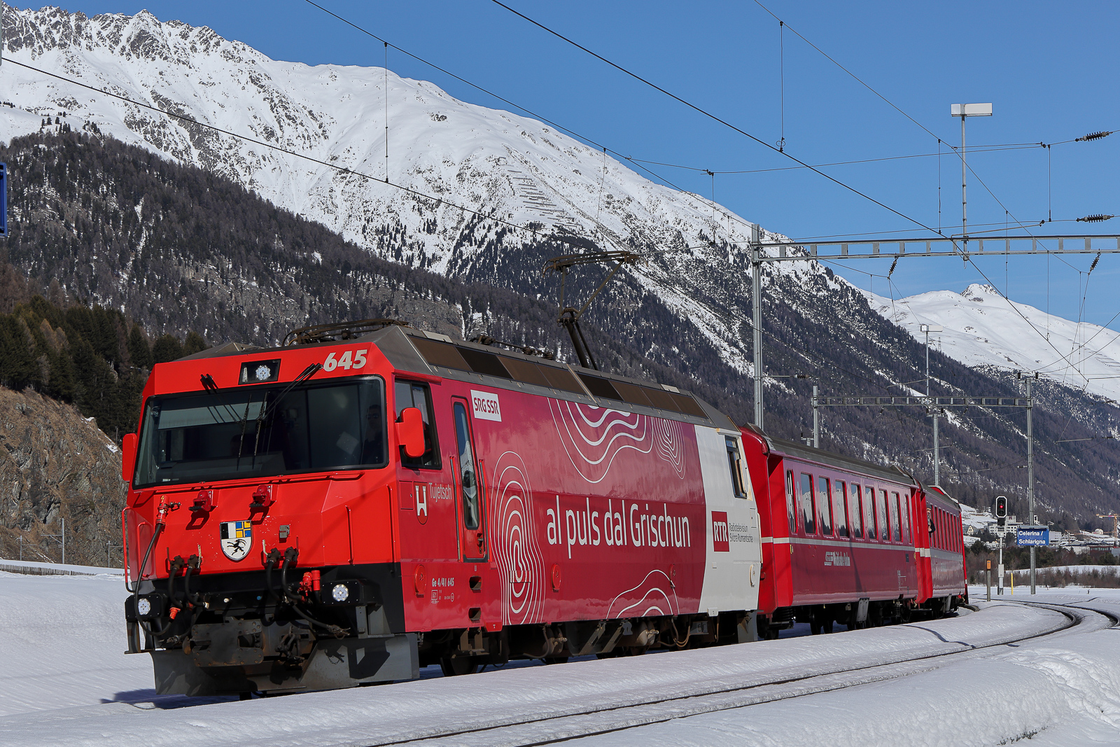 RhB, Ge 4/4III Nr 645 bei Celerina / Schlarigna kommen aus Samedan.