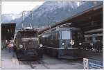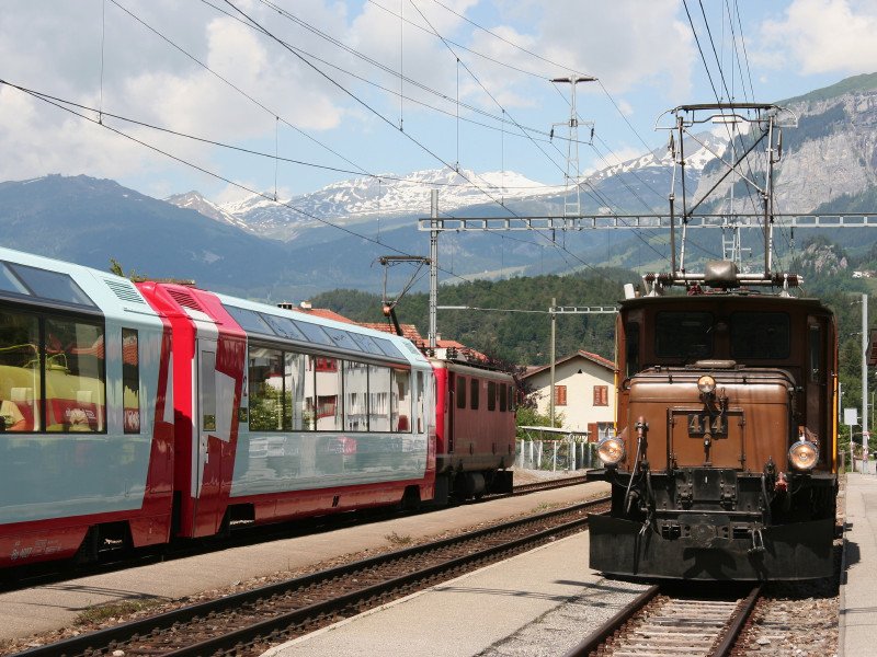 Treffen der Generationen: Glacier-Express mit Ge 4/4 I Nr. 608 "Madrisa" aus Davos-Platz mit den neuesten Panoramawagen (Premiere 2006) begegnen dem 77 Jahre älteren "Krokodil Ge 6/6 I Nr. 414 (Baujahr 1929) in Bonaduz beim Bahnhofsfest am 10. Juni 2007.
