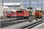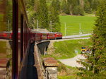 Die Ge 6/6 II 701 "Raetia" zieht einen Güterzug bergwärts durch Filisur.