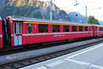 RhB Steuerwagen Bt 52 803 in Samedan am 16.09.2018. Im Gegensatz zum Allegra, der links steht, hat der Steuerwagen den weißen Steifen unter dem Fenstern.