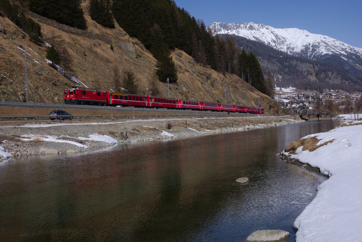 RhB Regionalzug 256 von S-chanf nach St.Moritz am 31.08.1993 in St.Moritz mit Triebwagen ABe 4/4 504 solo. Hinweis: 504er 1997a - 08/1998 Abbruch, gescanntes Dia