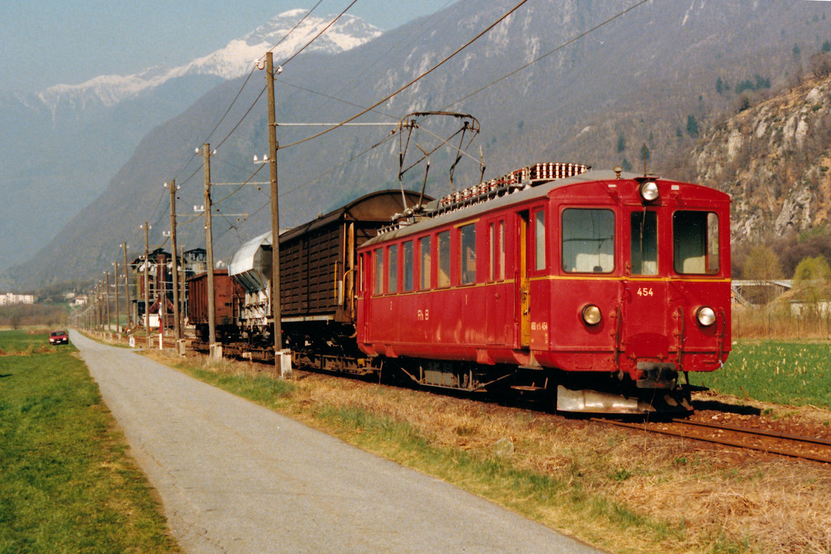 Regionalzug mit Doppeltraktion ABDe 4/4 unterwegs nach Arosa im März 1996 kurz vor Langwies beim Gründjitobelviadukt.