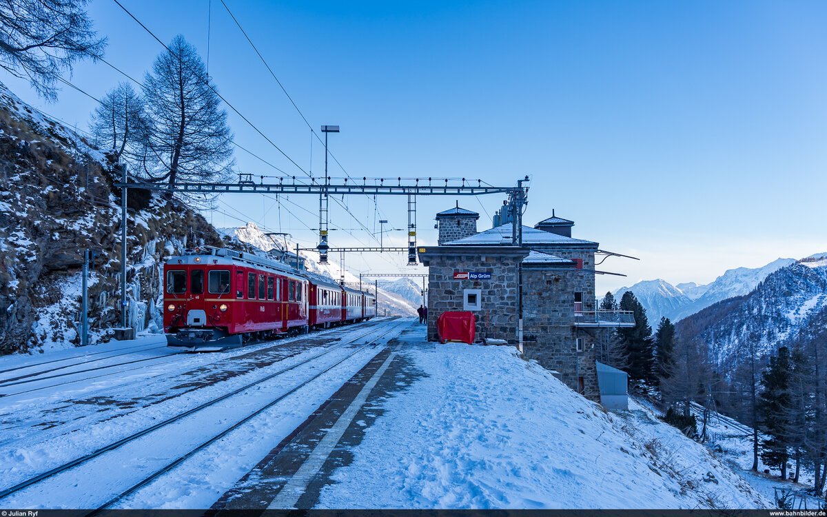 Zugskreuzung in Ospizio Bernina (2253 müM): der Bernina-Express Chur - Tirano wartet die Einfahrt des Regio mit dem Triebzug Allegra 3505 von Tirano nach St. Moritz ab. Ospizio Bernina, 7.8.2025 Markus Gmür