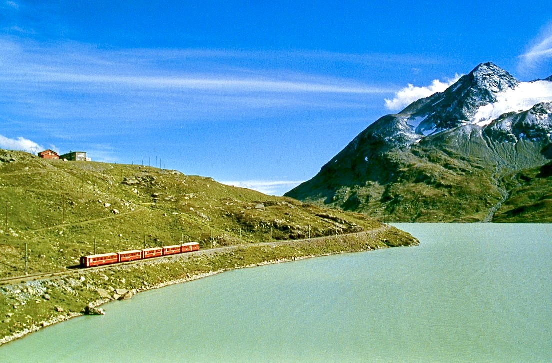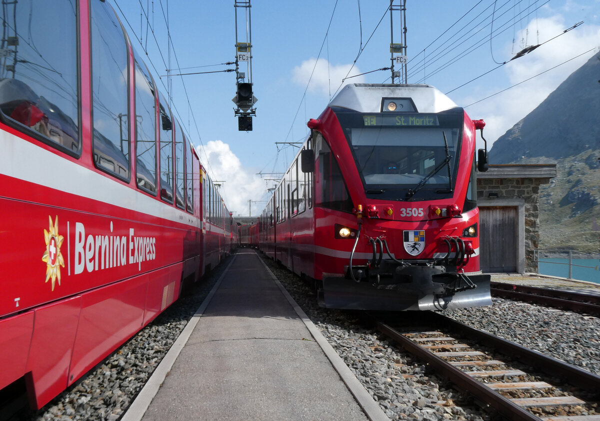 Zugskreuzung in Ospizio Bernina (2253 müM): der Bernina-Express Chur - Tirano wartet die Einfahrt des Regio mit dem Triebzug Allegra 3505 von Tirano nach St. Moritz ab. Ospizio Bernina, 7.8.2025