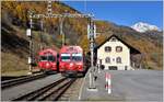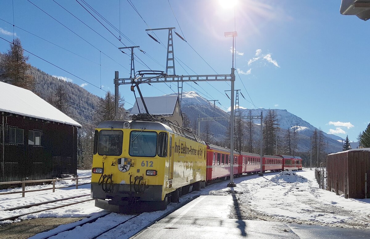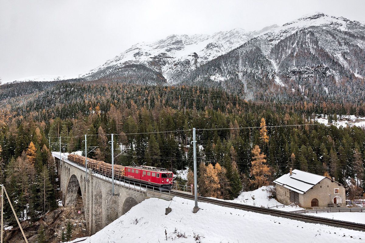 Die Ge 6/6 II 704 "Davos" fährt mit einem Holzzug über das Innviadukt in Cinous-chel.Bild 10.11.2017