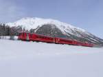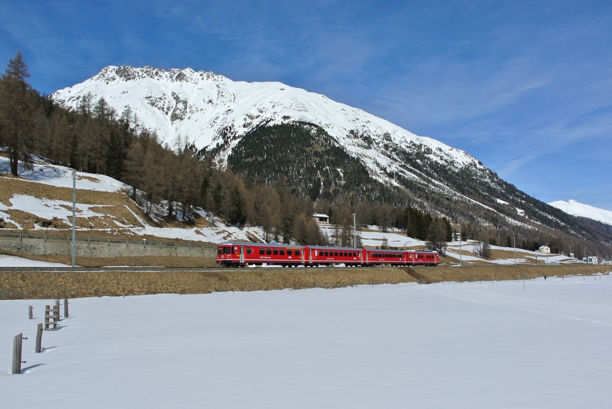 Engadin Skimarathon 2015: Auch ein Be 4/4 Pendel war im Engadin im Einsatz; Be 4/4 515 mit 2 B und dem ABDt 1714 als Extrazug 2342 Samedan - Vereina - Landquart bei Bever, 09.03.2015.