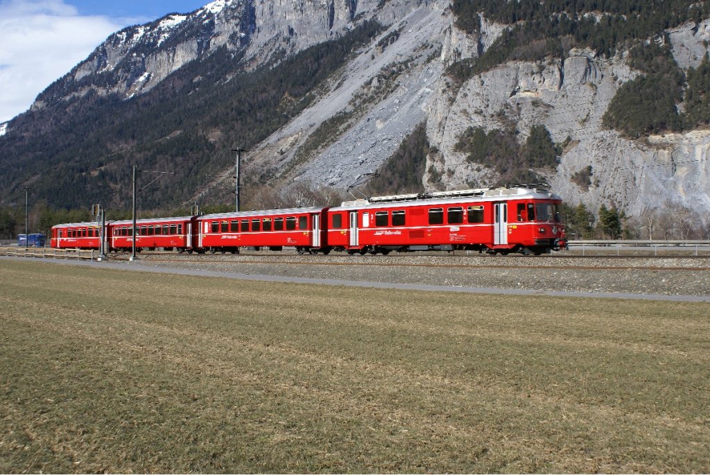 Ein Pendelzug, gezogen vom Be 4/4 515, fährt am 22.2.10 von Felsberg Richtung Chur.