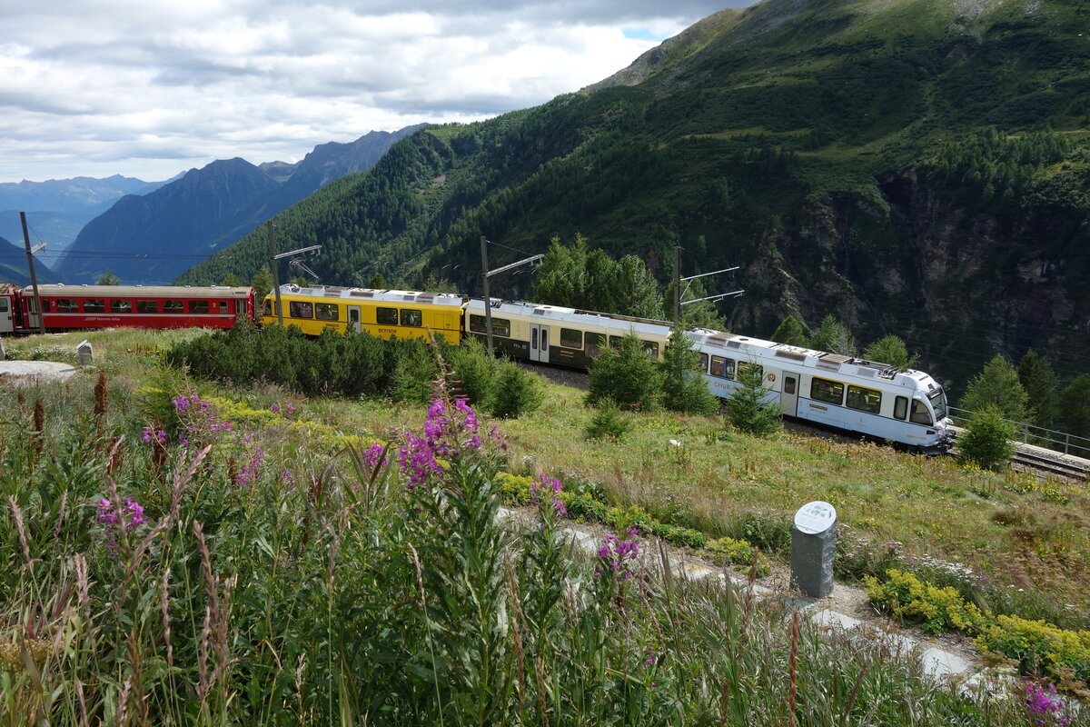 Regionalzug von Tirano nach St. Moritz mit den beiden offenen Aussichtswagen erklimmt die Steigung von Alp Grüm (2091 müM) nach Ospizio Bernina. Alp Grüm, 7.8.2025