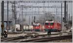 R7857 nach Ziegelbrücke, di e S1 nach Rhäzüns und die Holcim Em 837 954-7 treffen bei Zizers aufeinanser. (08.04.2013)