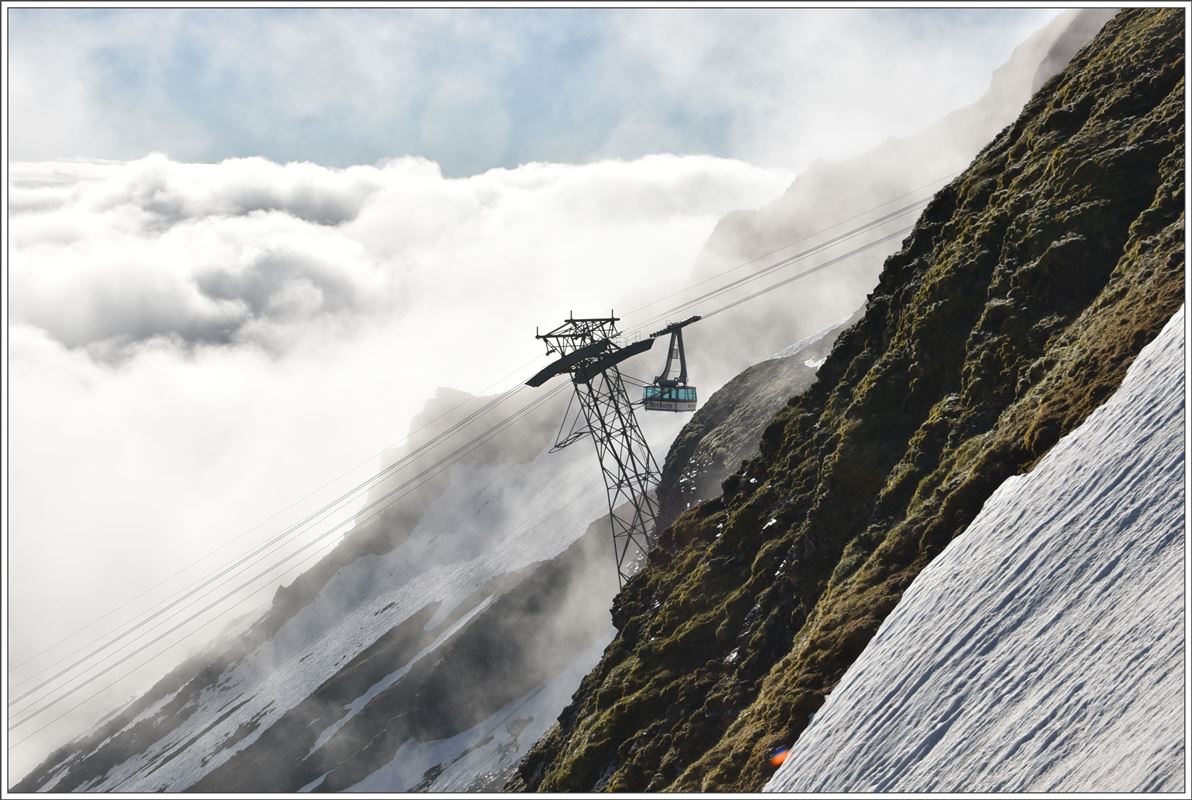 Ein herrlicher Tag beginnt auf dem Brienzer Rothorn. Neben der Dampfzahnradbahn von Brienz gibt es noch die Luftseilbahn von der andern Seite aus Sörenberg. Schon früh verlässt die erste Gondel, noch als Leerfahrt, das Rothorn und verschwindet im Nebelmeer. (20.06.2016)