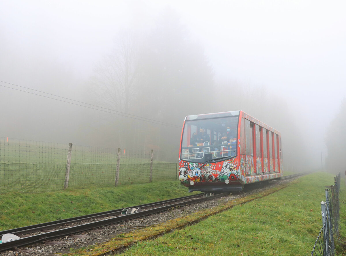 Die Gurtenbahn, die Standseilbahn auf den Berner Hausberg: Wagen 2 kommt aus einer unsichtbaren Welt. 21.November 2021