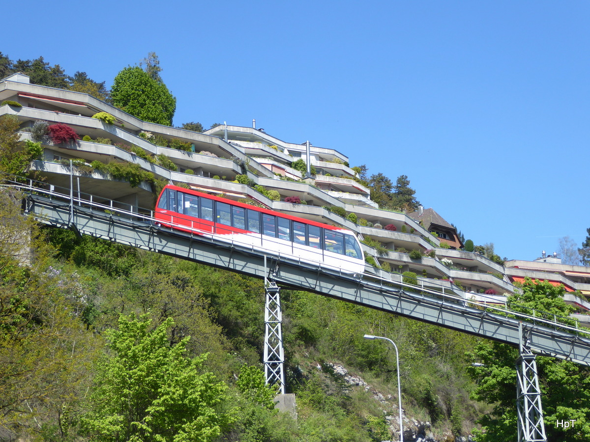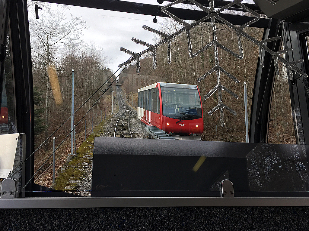 Biel-Leubringen-Bahn (2000 mit Biel-Magglingen-Bahn fusioniert zu FUNIC) kurz vor Einfahrt in die Bergstation Leubringen (frz. Evilard), 25. Dez. 2016, 15:30