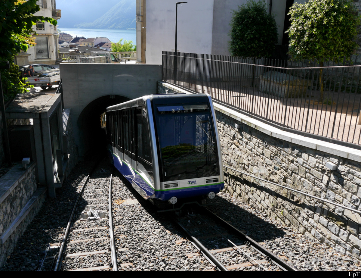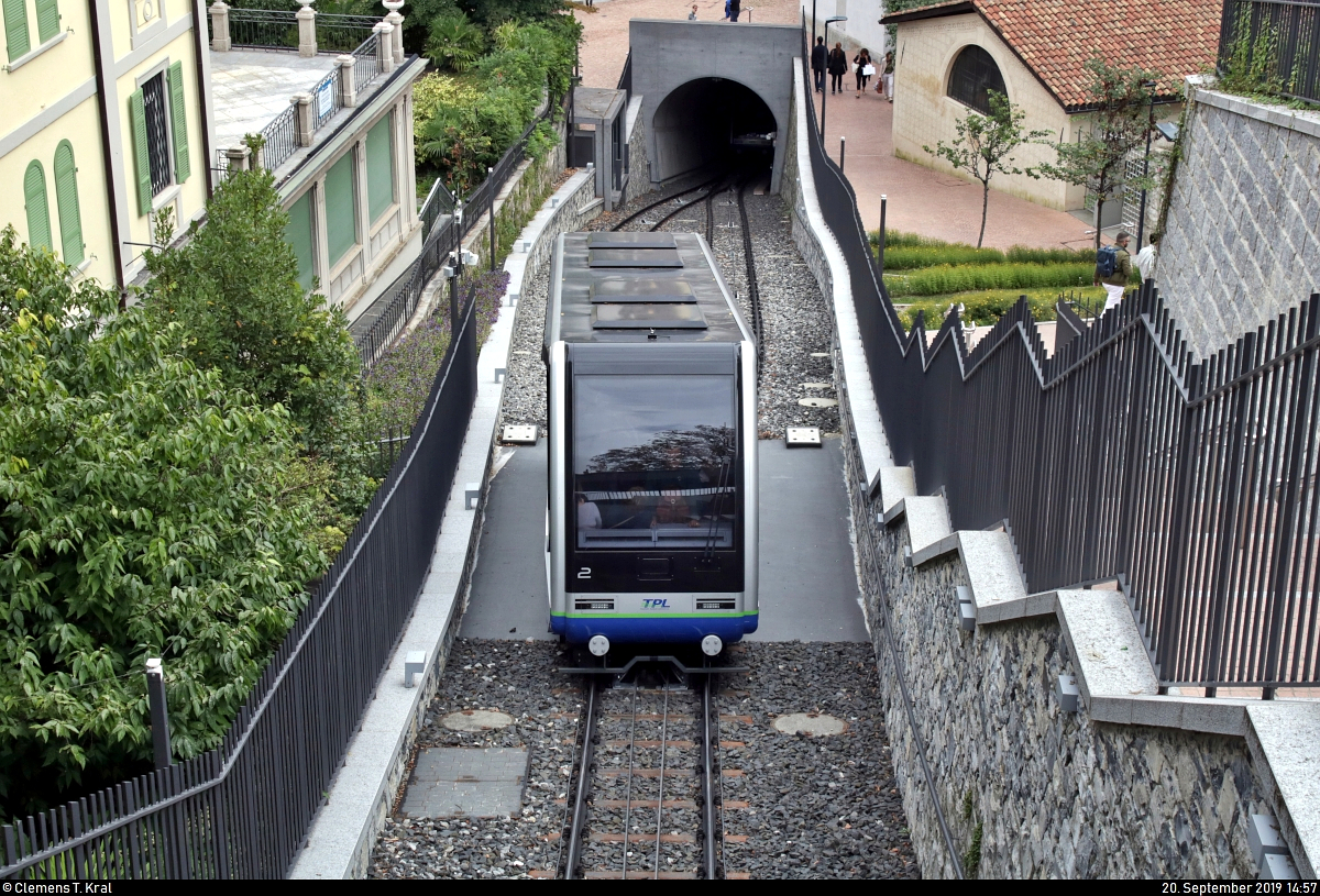 Wagen 2 der Trasporti Pubblici Luganesi SA (TPL), unterwegs als Standseilbahn Lugano–Bahnhof SBB (Funicolare Lugano Città–Stazione FFS) von Lugano Città (CH) nach Lugano Stazione (CH) befährt die Abt’sche Ausweiche nahe der Kathedrale San Lorenzo.