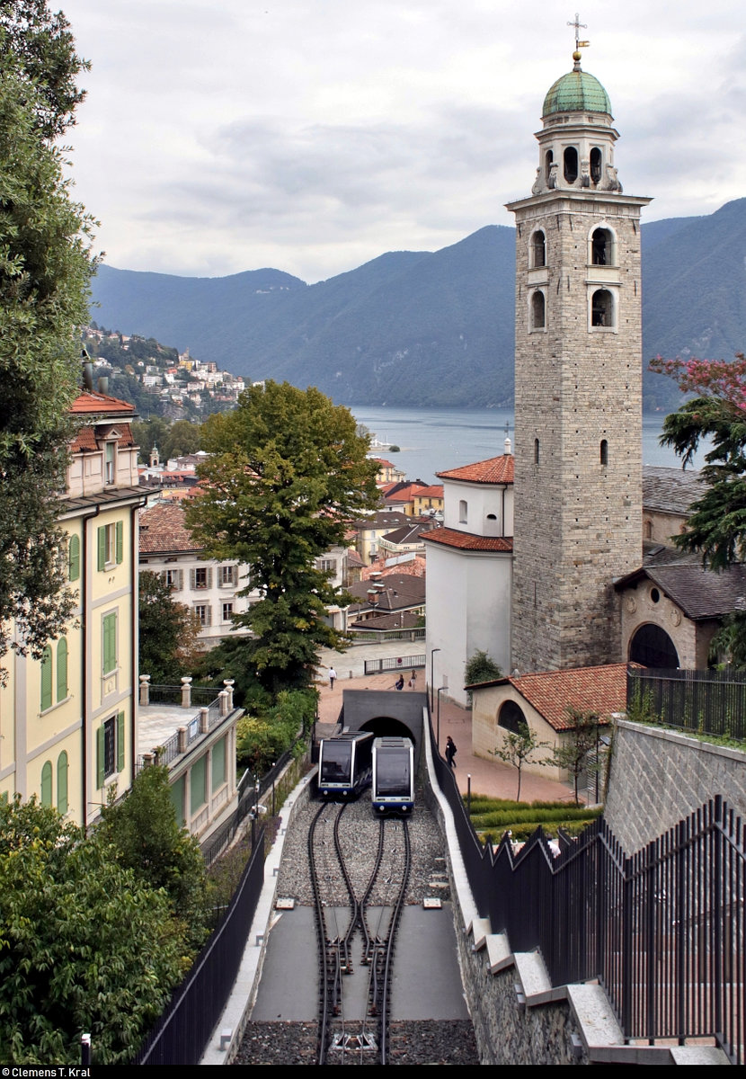 Wagen 1 und Wagen 2 der Trasporti Pubblici Luganesi SA (TPL), unterwegs als Standseilbahn Lugano–Bahnhof SBB (Funicolare Lugano Città–Stazione FFS) zwischen Lugano Stazione (CH) und Lugano Città (CH) begegnen sich an der Ausweiche bzw. Zwischenstation Lugano Cattedrale (Kathedrale San Lorenzo).