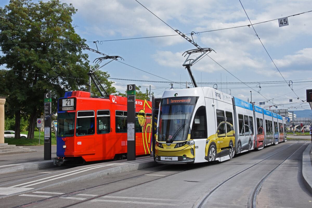 Bei der Haltestelle beim badischen Bahnhof treffen sich der Be 4/4 490 FC Basel, auf der Linie 21, und der Be 6/8 Flexity 5028 mit der AMAG Werbung, auf der verlängerten Linie 1. Die Aufnahme stammt vom 13.08.2021.
