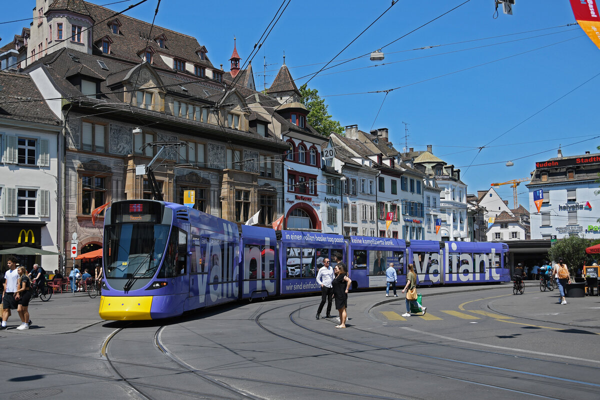 Be 6/10 Tango 151 mit der Werbung für die Bank Valiant, auf der Linie 11, verlässt am 14.06.2023 die Haltestelle Barfüsserplatz.