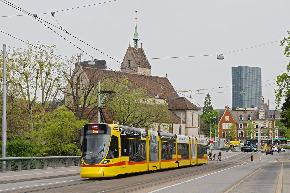 Be 6/10 Tango 174, auf der wegen einer Grossbaustelle am Steinenberg umgeleiteten Linie 11, überquert am 08.04.2024 die Wettsteinbrücke.