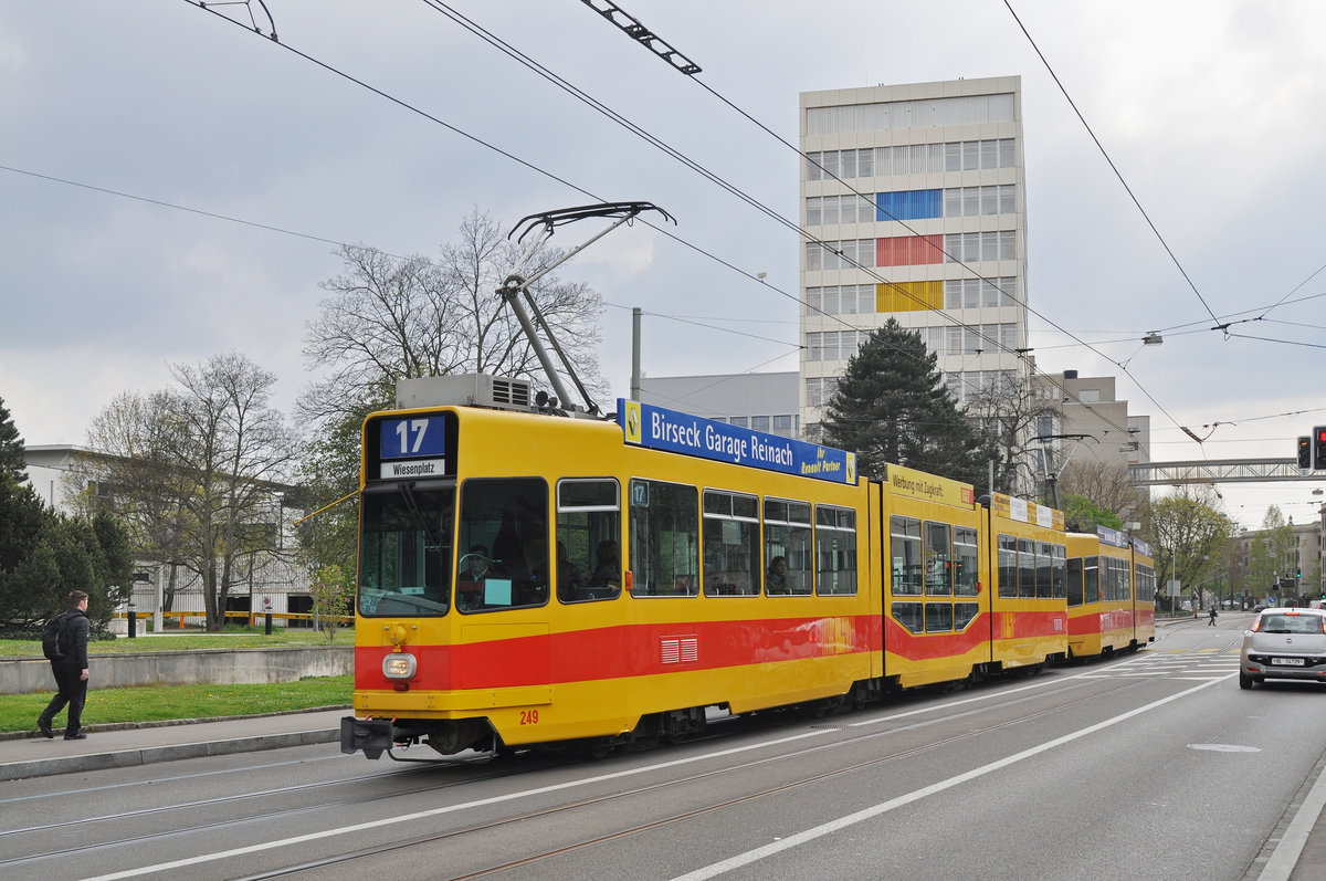 Doppeltraktion, mit dem Be 4/8 249 und dem Be 4/6 228, auf der Linie 17, fahren zur Endstation am Wiesenplatz. Die Aufnahme stammt vom 03.04.2017.