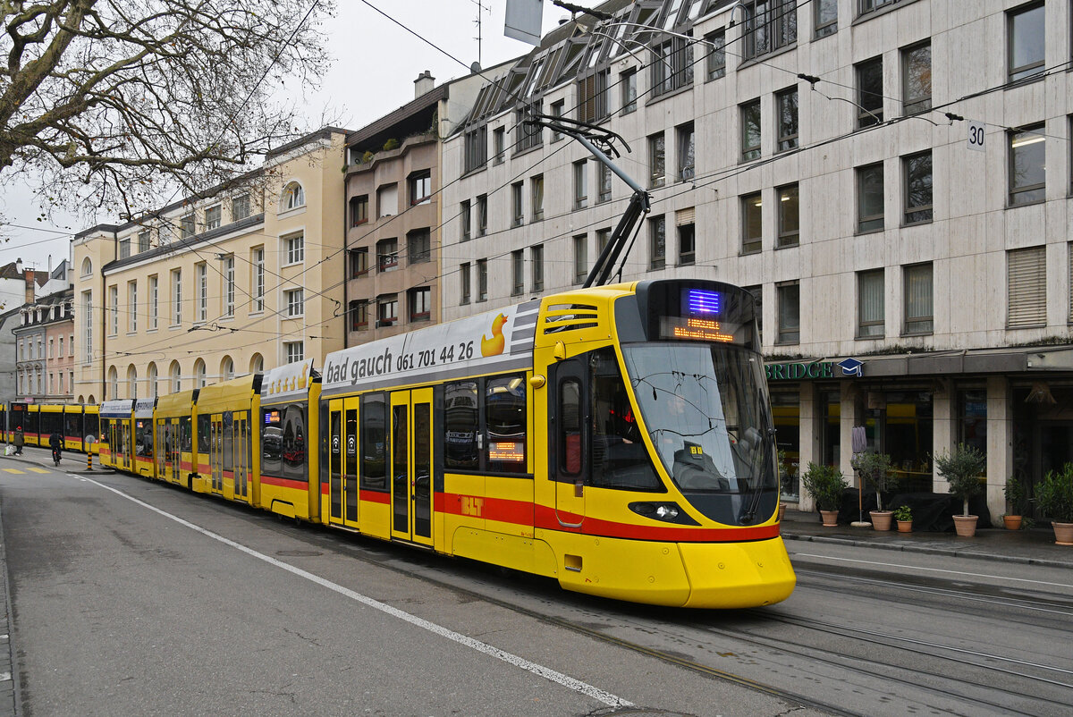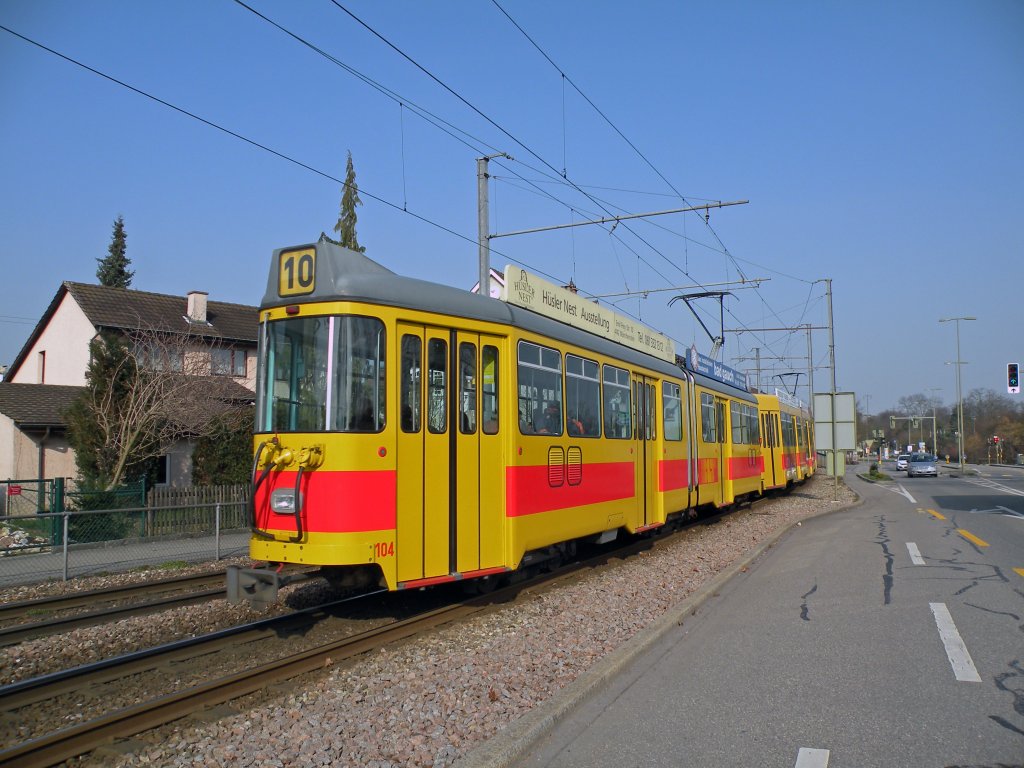 Be 4/6 mit der Betriebsnummer 104 auf der Fahrt zur Haltestelle Neue Welt. Die Aufnahme stammt vom 08.03.2011.