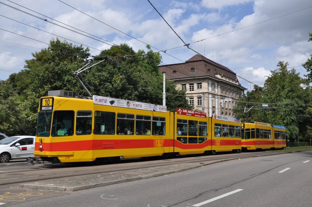 Be 4/8 mit der Betriebsnummer 239 auf der Linie 10 fährt zum Lichtsignal beim Bahnhof SBB. Die Aufnahme stammt vom 13.08.2011.