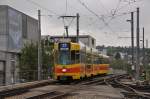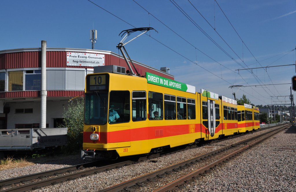 Doppeltraktion mit dem Be 4/8 203 und dem Be 4/6 261 auf der Linie 10 fahren zur Haltestelle Hüslimatt. Die Aufnahme stammt vom 15.08.2012.