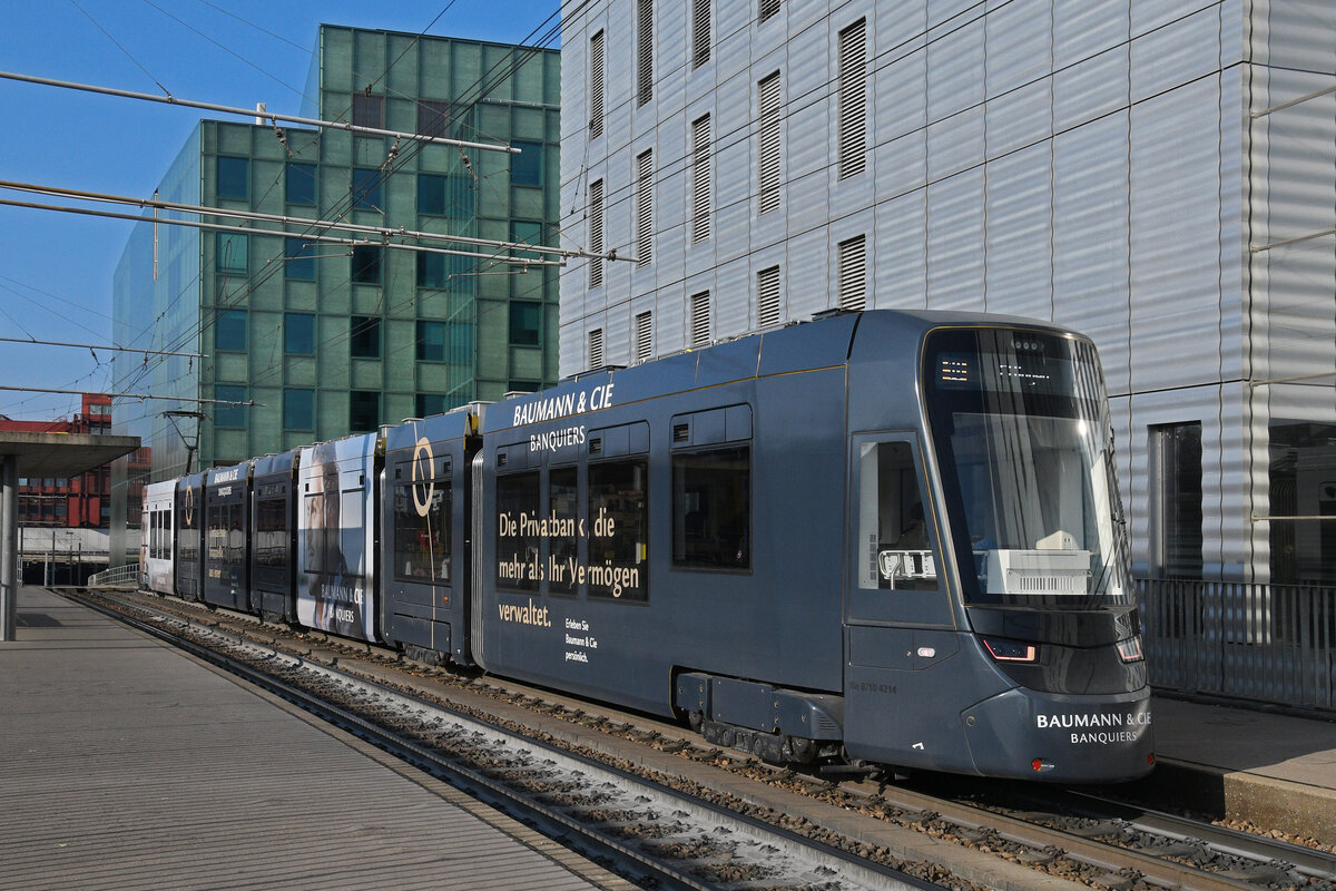Be 8/10 TINA 4214 mit der Werbung für Baumann & Cie, auf der Linie 10, bedient am 29.12.2025 die Haltestelle Peter Merian. Aufnahme Basel.