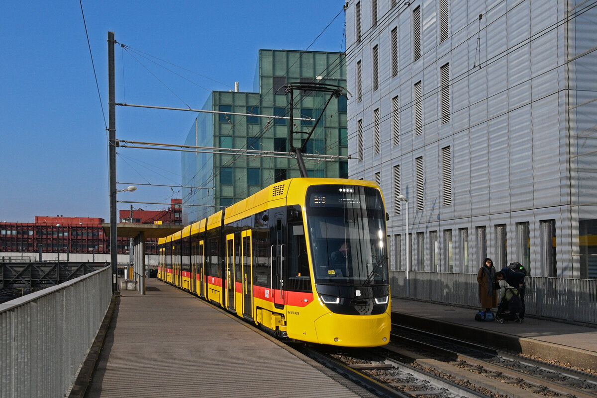 Tango mit der Betriebsnummer 166, noch ohne jegliche Werbung, steht vor der Lichtsignalanlage am Bahnhof SBB.