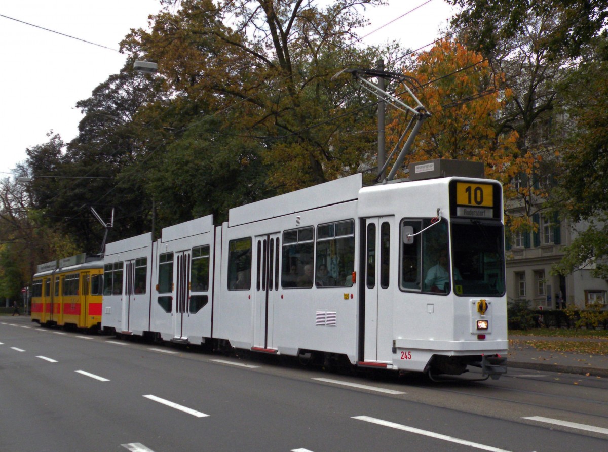 Seit anfangs Oktober hat der Be 4/8 245 seine IWB Bilder und Schriften verloren und ist total Weiss auf der Linie 10 unterwegs. Die Aufnahme stammt vom 25.10.2013.