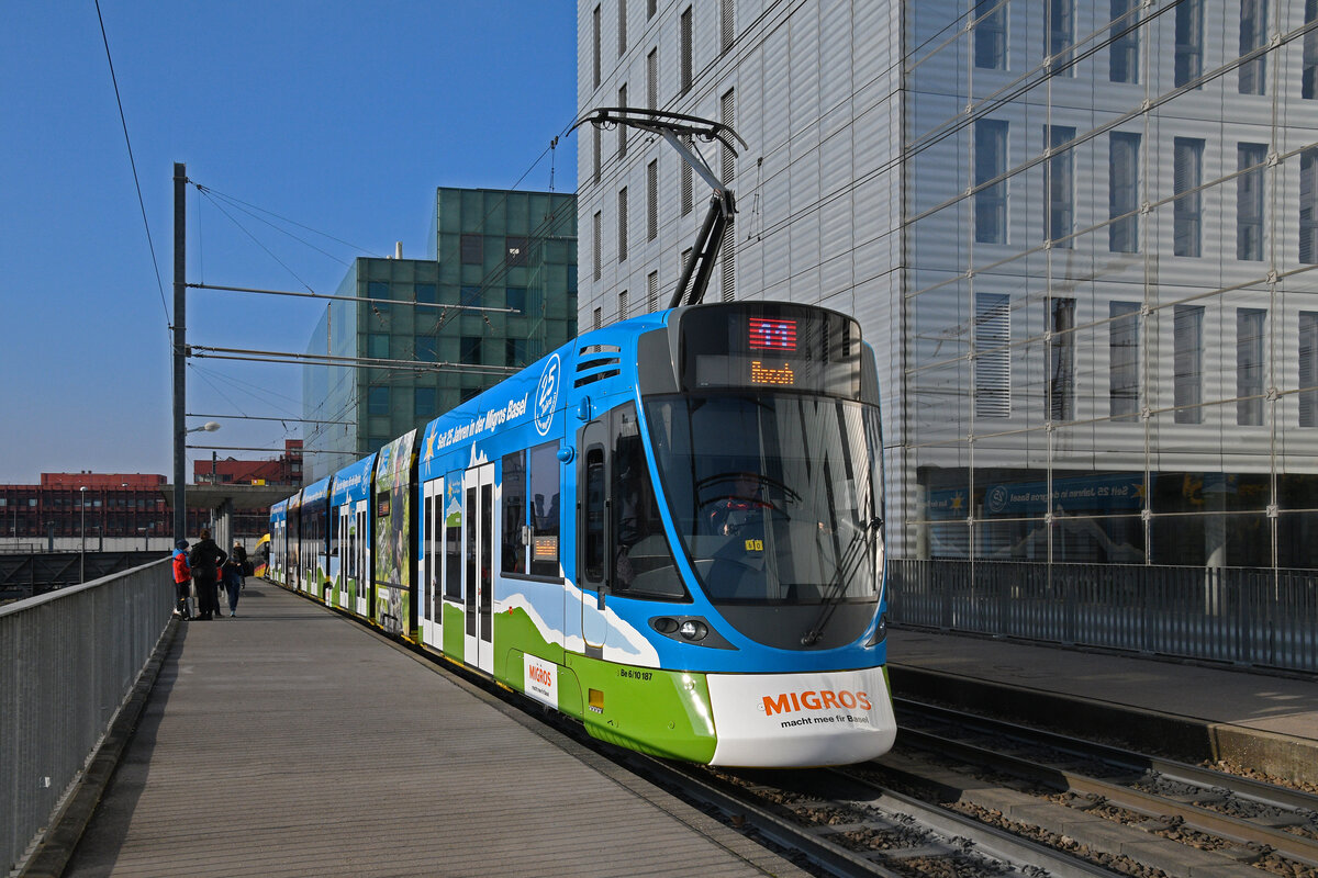 Be 4/8 245 zusammen mit dem Be 4/6 231 , auf der Linie 10, fahren zur Haltestelle in Ettingen. Die Aufnahme stammt vom 03.10.2015.