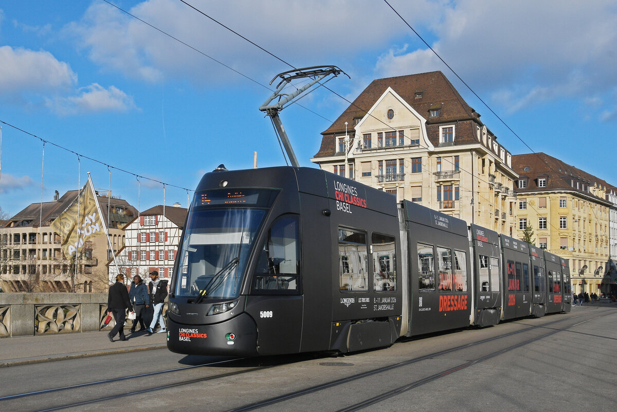 Be 6/8 Flexity 5009 mit der Werbung für Pferdeanlässe in Basel, auf der Linie 14, überquert am 27.11.2025 die Mittlere Rheinbrücke. Aufnahme Basel. Markus Wagner