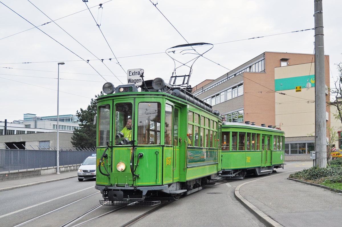 Be 2/2 163 zusammen mit dem B3 702 gehen auf eine Probefahrt und verlassen die Hauptwerkstatt. Die Aufnahme stammt vom 06.04.2017.