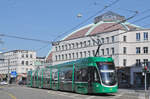 Be 4/6 Flexity 6011 mit der Werbung für die Konfitüre von Zuegg, auf der wegen einer Baustelle umgeleiteten Linie 3, fährt am 07.04.2026 zur Haltestelle am Aeschenplatz. Aufnahme Basel.