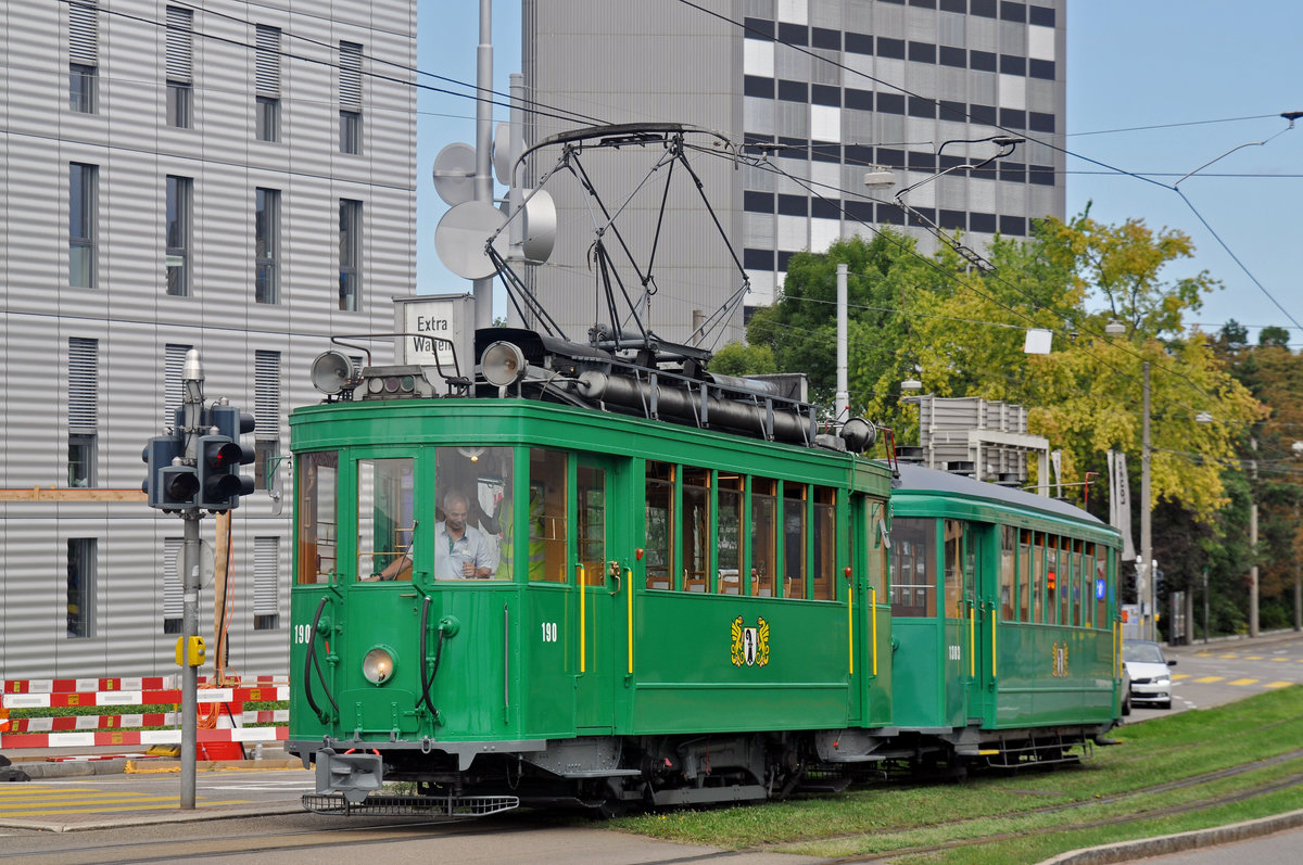 Be 2/2 190 zusammen mit dem B3 1303 fahren nach einer Extrafahrt zurück ins Depot Dreispitz. Die Aufnahme stammt vom 06.08.2017.