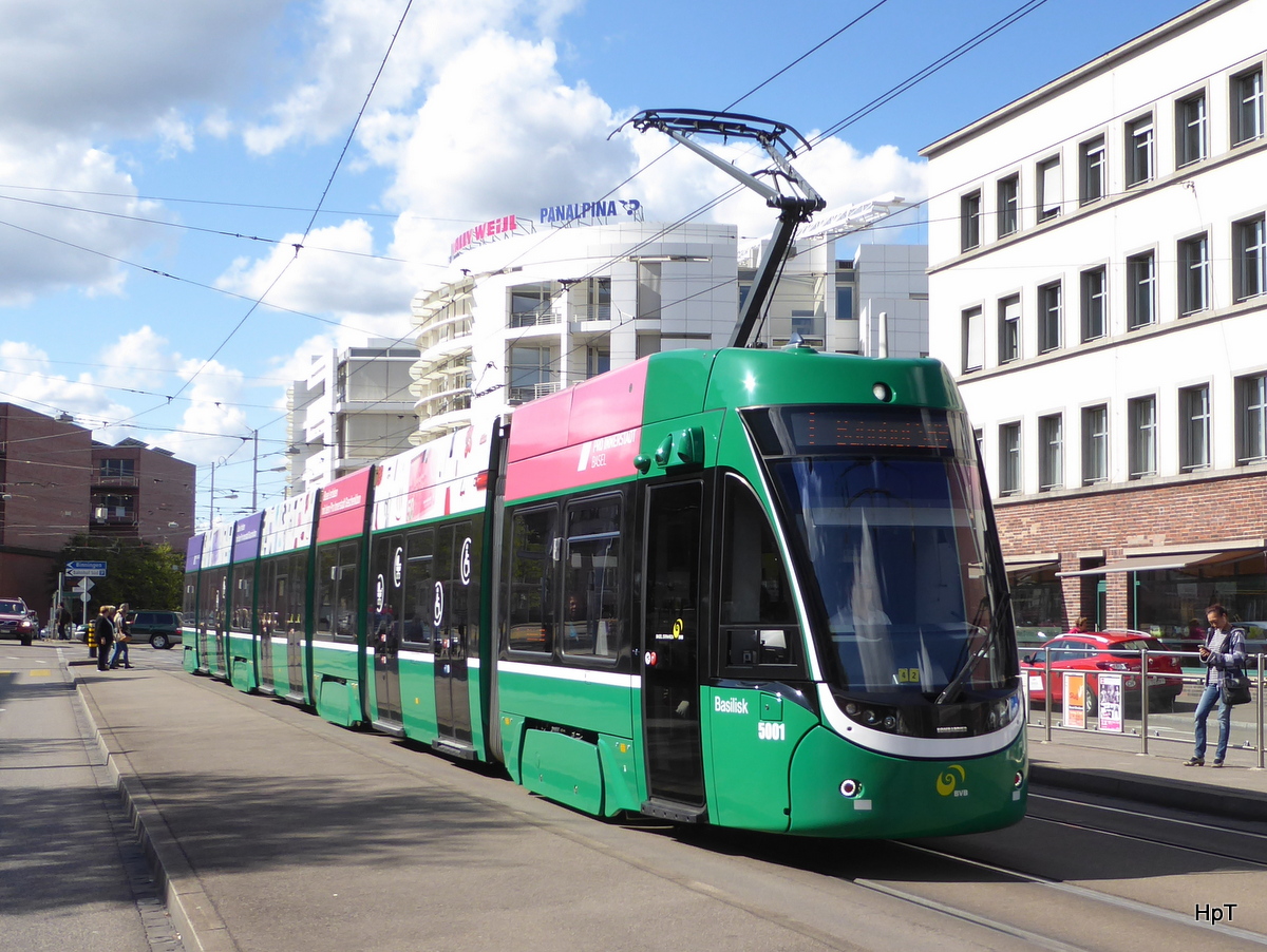 BVB - Tram Be 6/8 5001 unterwegs in der Stadt Basel am 15.09.2017