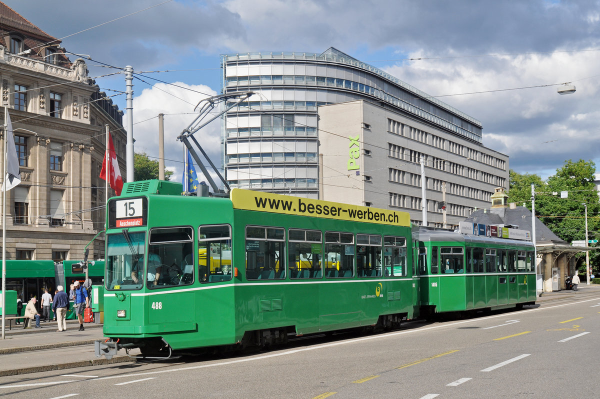 Baustelle am Steinenberg. Wegen der Baustelle wendet die Linie 15 bereits am Aeschenplatz. Hier wartet der Be 4/4 488 zusammen mit dem B4S 1495 an der Endstation am Aeschenplatz. Die Aufnahme stammt vom 10.09.2017.