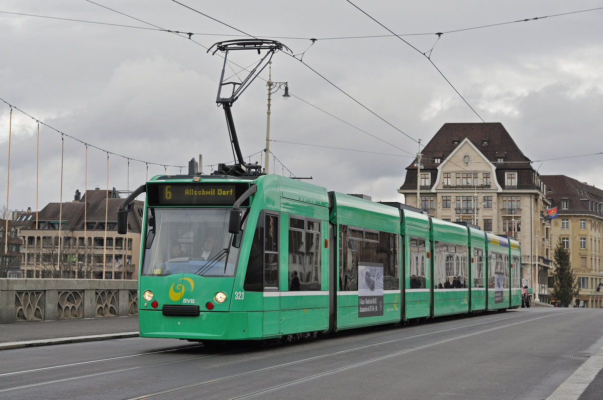 Be 6/8 Combino 323, auf der Linie 6 überquert die Mittlere Rheinbrücke. Die Aufnahme stammt vom 29.11.2017.